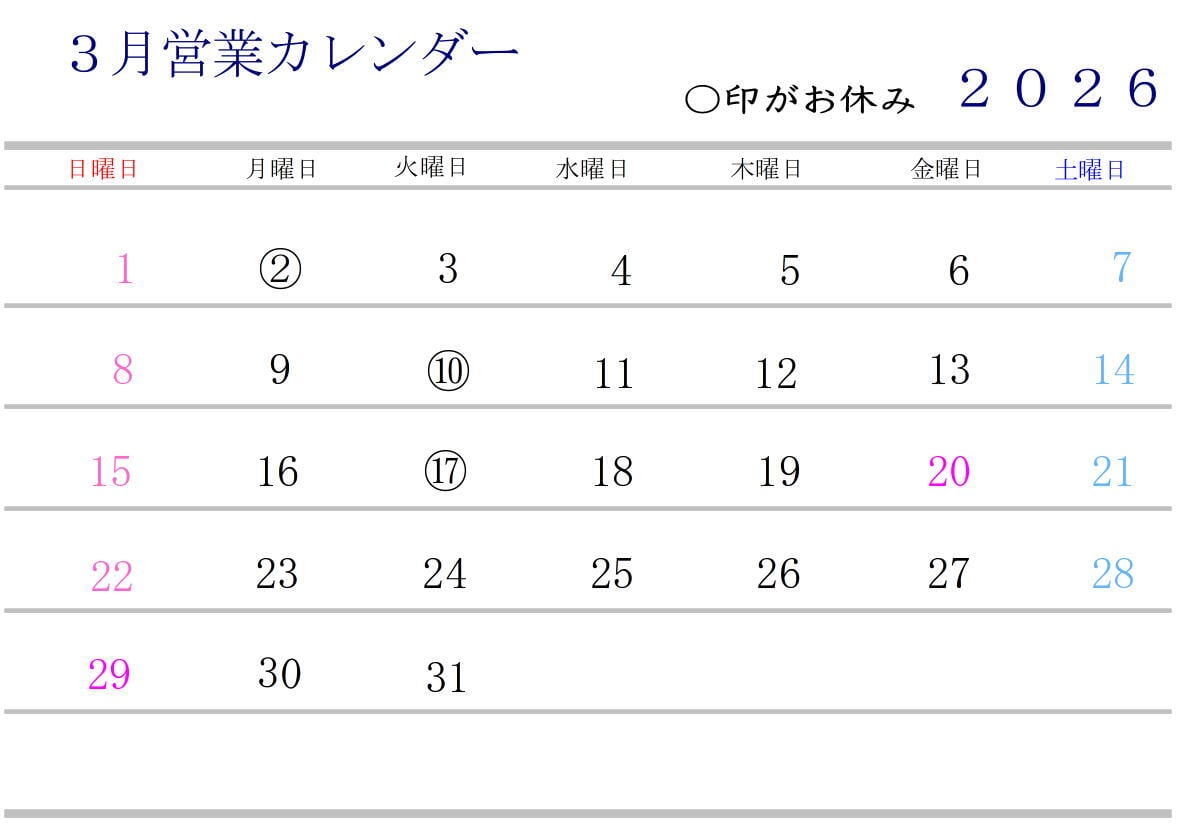 3月の営業カレンダーです。 3月2日は臨時休業させて頂き、 3日のひな祭りは営業させて頂きます。 ご迷惑をおかけ致しますがよろしくお願い申し上げます。 3月24日からは春の無休営業になります。