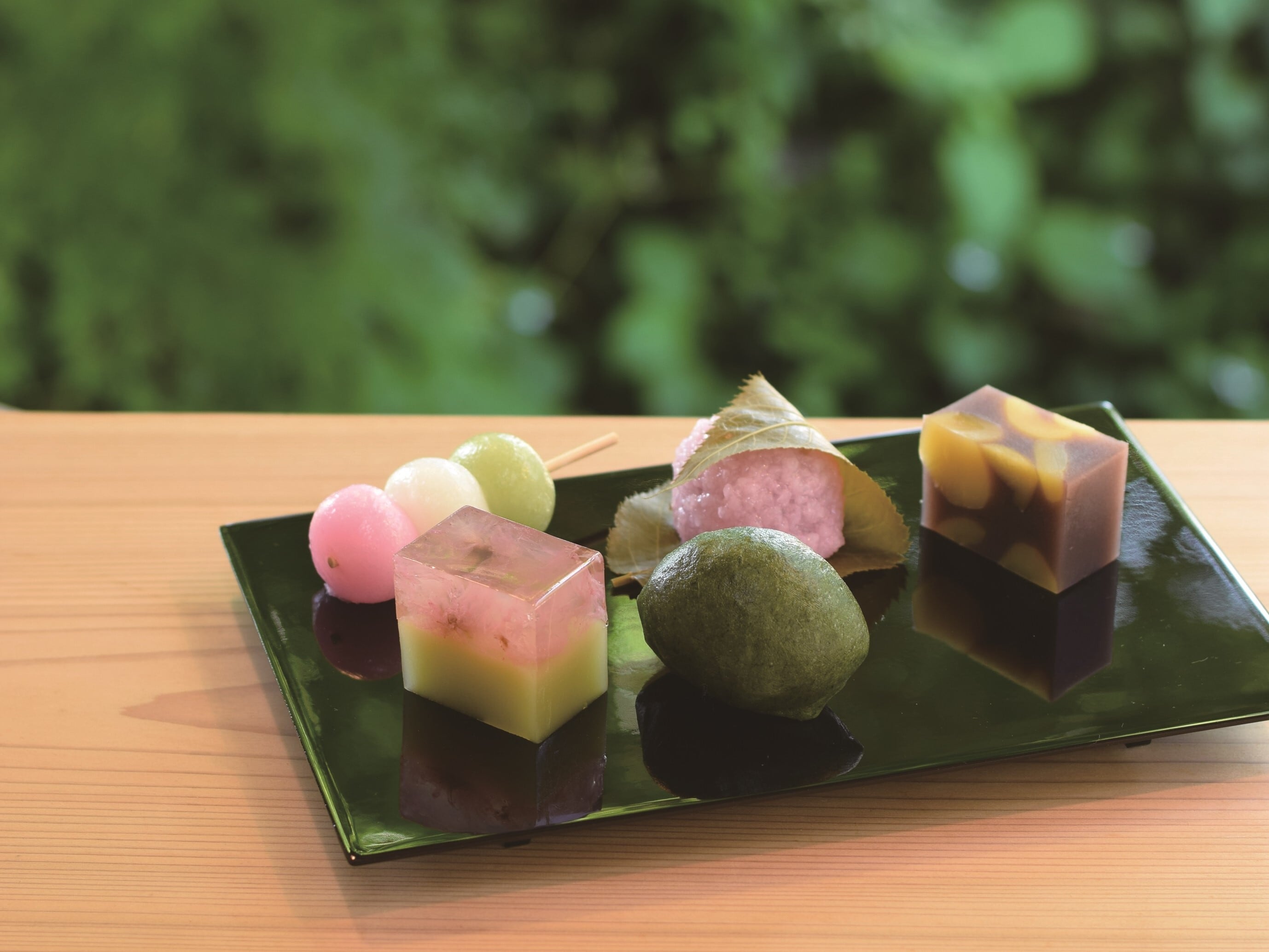 桜の名所として愛される吉野山。山一面に広がる桜の風景を1年中楽しめるようにとの願いを込めて作りました。吉野山の緑と満開に咲いた桜を表現。あっさりとした羊羹の甘さと塩漬けにした桜の塩味の調和をお楽しみいただけます。